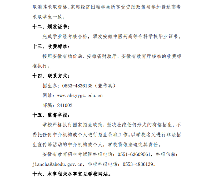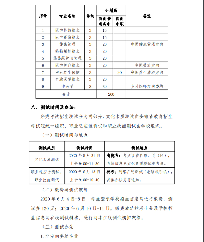 安徽中医药高等专科学校2020年分类考试招生章程