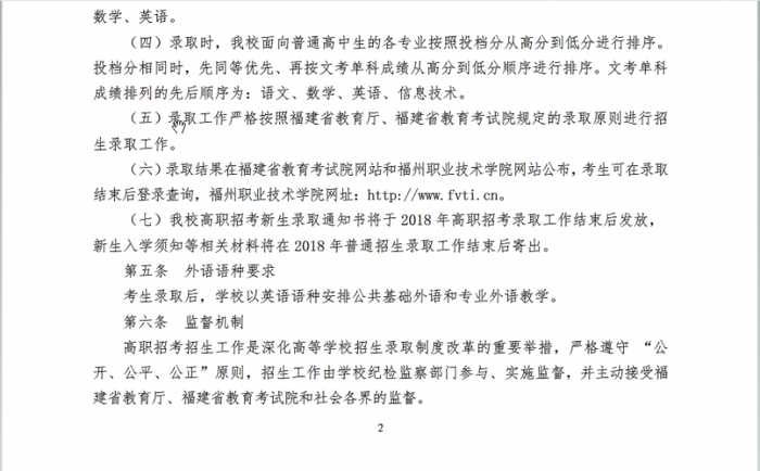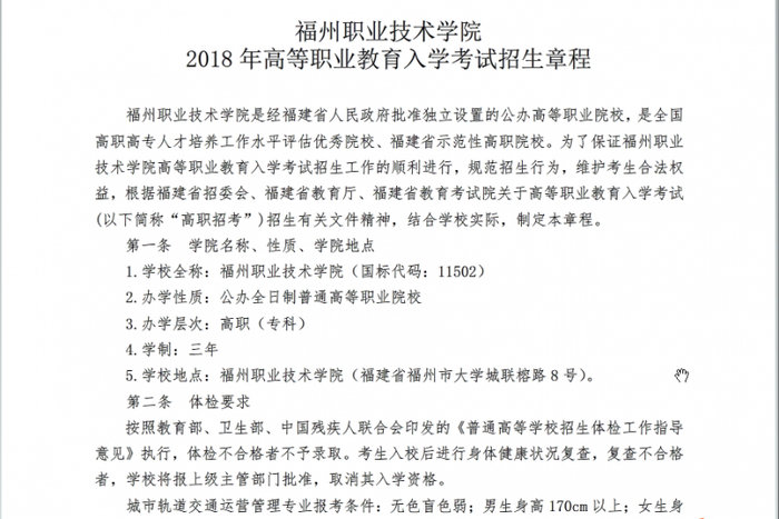 福州职业技术学院2018年高职招考招生章程