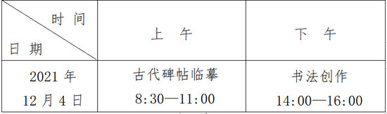 考试科目为古代碑帖临摹、书法创作两科,每科满分150分,总分300分。