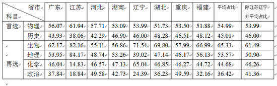 除江苏、辽宁外六省市首选物理的学生平均占比约为53.99%,相比“3+理综”高考模式,选考物理的人数有所下降。