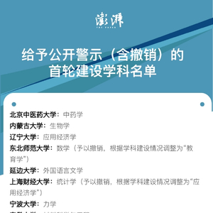 2月14日,澎湃新闻从教育部召开的新闻通气会上获悉,第二轮“双一流”建设学科不调出,但对整体发展水平相对一般,可持续发展能力、成长提升程度都不突出的16个建设学科进行约谈,并给予公开警示,相关学科应加强整改,2023年将接受再评价。届时未通过评价将调出“双一流”学科建设范围。