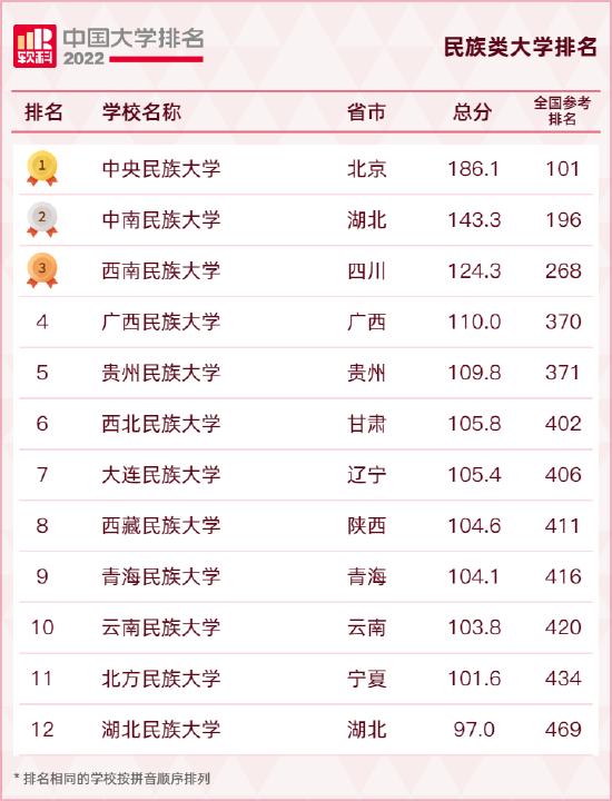 2022软科中国民族类大学排名的上榜高校有12所,中央民族大学、中南民族大学、西南民族大学位列前三。