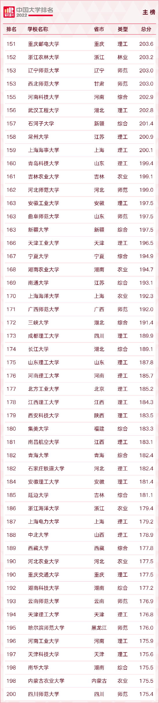 “2022软科中国大学排名”的对象是中国1000多所本科层次的高校,为恰当反映高校在学校性质和学校类型上的差异、确保排名的公平性,软科将高校划分为综合性大学、7类单科性大学、2类非公办大学,采用差异化的指标体系分别排名。