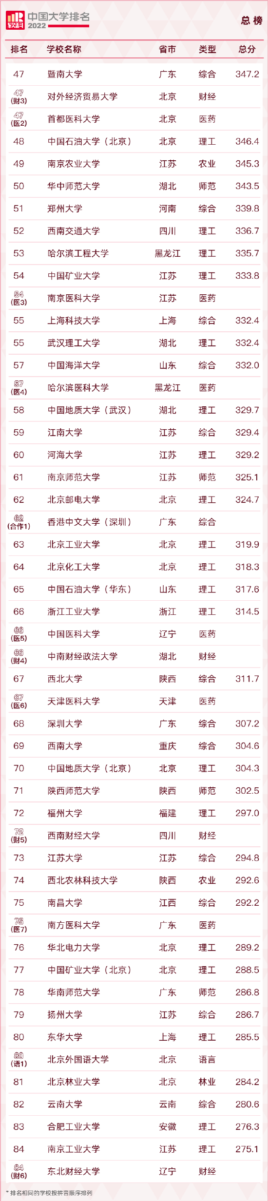 (2022年4月19日)高等教育专业评价机构软科今日正式发布“2022软科中国大学排名”。清华大学、北京大学、浙江大学蝉联主榜(即综合性大学排名)前三位。北京协和医学院位列医药类大学排名第一,上海财经大学位居财经类大学排名榜首,北京外国语大学名列语言类大学排名第一,中国政法大学位列政法类大学排名榜首,中央民族大学占据民族类大学排名首位,上海体育学院领跑体育类大学排名,香港中文大学(深圳)在中国合作办学大学排名中夺冠。