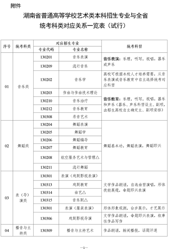 附件:湖南省普通高等学校艺术类本科招生专业与全省统考科类对应关系一览表(试行)