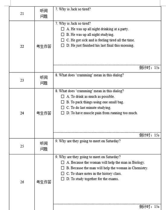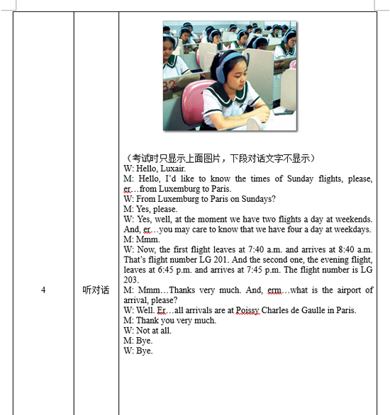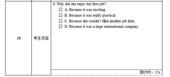 第一节:听3个长对话。每听完一个长对话,回答3个问题,共9小题。每小题给出A、B、C、D四个选项,每小题考生有15秒的时间用鼠标点击最佳选项。每段对话读两遍。