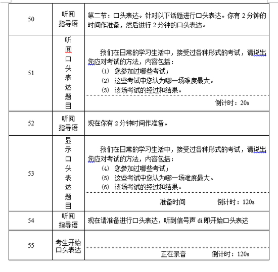 第二节:口头表达。考生先用20秒时间看屏幕中给出的话题和要求,然后用2分钟的时间作准备,最后根据给出的话题和要求用英语进行口头表达,回答时间为2分钟。