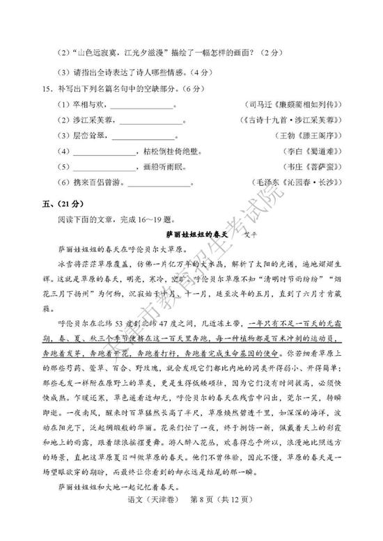 新浪教育讯 2019 年高考语文考试已结束,以下为2019 高考语文真题(天津
