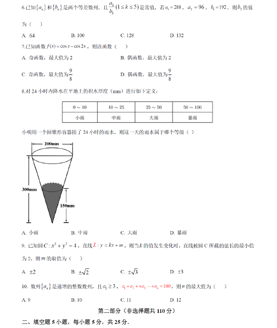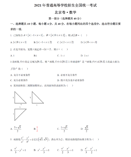 以下为2021年普通高等学校招生全国统一考试 北京卷·数学