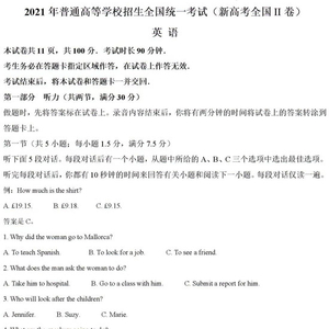 以下为2021高考英语真题及参考答案(新高考全国Ⅱ卷)。