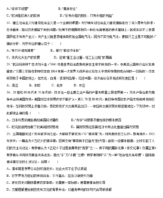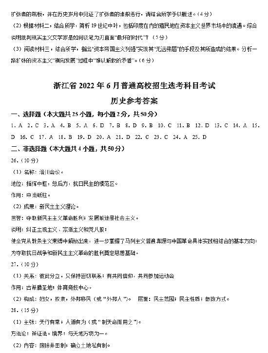 以下为2022高考历史真题及参考答案 (浙江卷)
