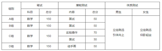 (2)潜能测试:6月15日下午进行,全面考察考生的理想、品德、诚信等素质,侧重考查学生的学科特长和创新潜质。具体内容详见上表。无相应考试大纲和往年试题作参考。