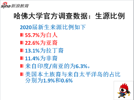 近几年招生季,连续爆出常青藤大学录取率下降,从10%左右降到6%,什么样的学生才能成为那6%的佼佼者?在讲座的最初黄德容老师分享了一组哈佛大学的录取数据。白人学生比例最高,超过55%,因为涉及到校友捐款和语言文化优势,毫无疑问,白人学生有压倒性优势;其次是亚裔,占比22%,因为亚裔学生擅长学习,可以提交优异的标准化考试成绩。