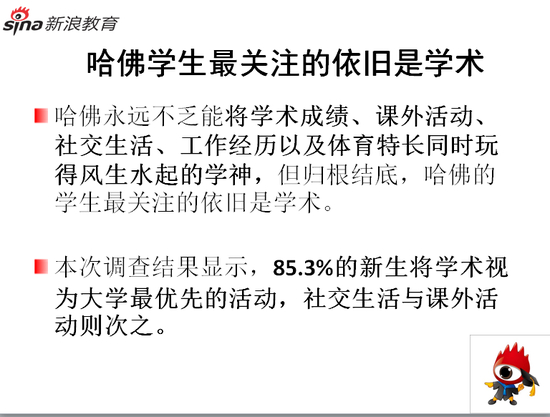 下面有一个数据是名校录取学生的权重,学校考虑学生的前三个因素分别是学术表现,体育活动,工作经验,且学术能力排在第一位,这个认知和学生本人也是一样的,超过85%的哈佛学生认为学习依旧是大学生活的主旋律。
