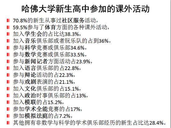 随着中国学生和家长对申请美国名校的重视,课外活动变成了申请过程中劳心费力的一个主要内容,不过黄老师在讲座中分析说,现在的学生为了申请名校已经有点“用力过猛”,他们去四川照顾大熊猫,去非洲做义工,去东南亚教小朋友英语,但是哈佛大学官方统计显示,招生官最喜欢的课外活动是“社区活动”,因为只有社区活动可实施性强、效果好,才符合青少年服务社会的理念。第二个是体育锻炼,因为美国高校重视运动,而且学生在运动中学会团队合作,学会拼搏进取。