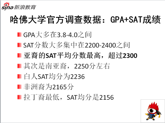 在如哈佛一流的学神学霸聚集地,他们的GPA、SAT、ACT等硬件分数究竟有多高?黄德容老师展示了一组一手资料,2016哈佛大学的大一新生,他们的GPA通常在3.8-4.0之间,当然GPA不是完全期末考试的成绩,几乎所有的哈佛学生都会考AP,而AP可以让学生大大加分,从3.8加到4.3。而SAT分数是2200-2400左右,其中亚裔学生的分数最高,超过2300分,是新生中名副其实的学霸。当然硬件分数不是录取的全部,这只是一个“入场券”,后面还有更多的“综合实力”。