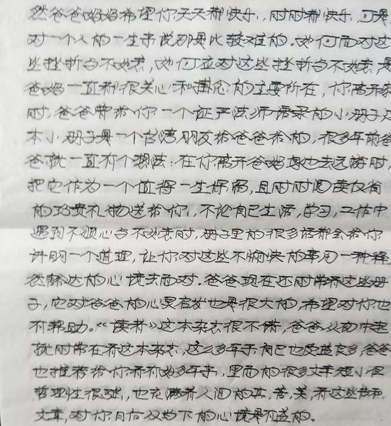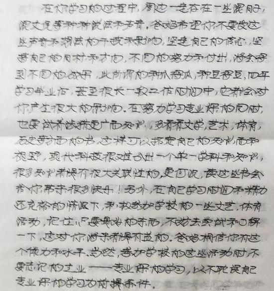 本栏目开通以来,受到多位家长关注。此前一封国际教育行业爸爸给女儿的万字长信(点击链接查看)让无数孩子在外留学的家长为之动容。近日,圈圈又收到家长来信:一位父亲在孩子上大学之前,手写7页信纸,给孩子送上谆谆教诲。豆豆爸爸告诉我们,他“送儿子去南京的学校报到后放在儿子枕头下”,真是以前的车马很远,书信很慢,但情最深,以下是这位父亲的文字: