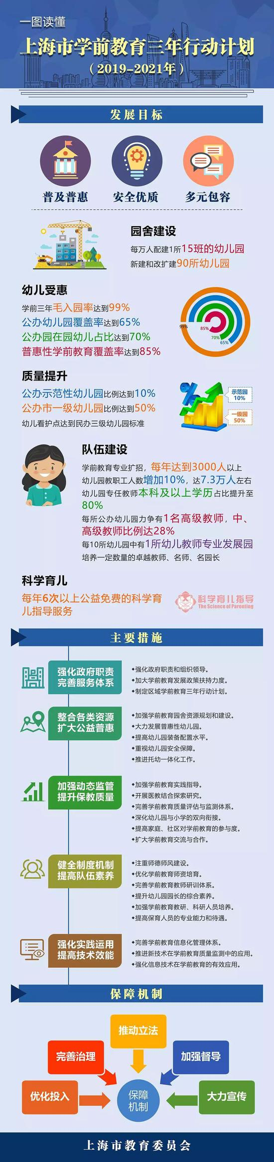 近日,上海市教委、市委编办、市发展改革委、市公安局、市财政局、市人力资源社会保障局、市规划资源局、市住房城乡建设管理委、市农业农村委、市卫生健康委、市市场监管局、市房屋管理局等12部门联合印发了《上海市学前教育三年行动计划(2019-2021年)》(简称《行动计划》),其中明确未来三年民办普惠园比重达85%。