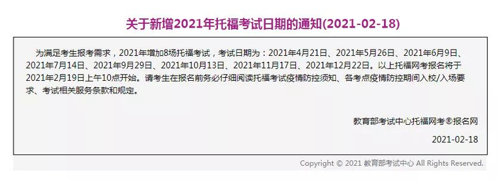 ETS官宣2021年新增8场托福考试 2月19日起即可报名 新浪教育 2021.02.1817:33 关注 ETS官方于今天突然发布正式公告: 2021年将会新增8场托福考试,2月19日上午10点,以上场次即可开始报名!