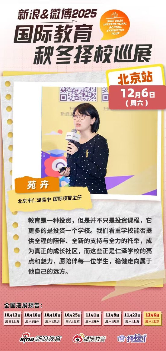 在此背景下,12月6日,由新浪教育、微博教育、择校行联合主办的新浪&微博2025国际教育秋冬择校巡展·北京站第二场顺利举行。活动汇聚京城80余所优质国际化学校招生官,搭建家长与校方面对面深度沟通的桥梁;同时邀请20余位资深校长、教育专家及优秀学生代表,从择校策略、课程规划、家庭赋能、教育趋势及学习实践等多元维度分享解惑,助力北京家庭精准把握国际教育动态,明晰升学路径。