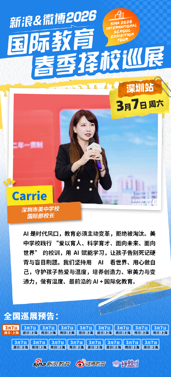 为回应这一迫切的择校需求,3月7日,新浪&微博国际教育春季择校巡展·深圳站汇聚大湾区升学成绩领跑的老牌强校,以及创新办学、特色鲜明的新锐学府,通过校长专家讲座、1对1深度咨询等环节,助力择校家庭在课程体系、师资团队、校园文化等方面优中选优。本次巡展致力于搭建家校透明沟通桥梁,提供客观权威的择校参考,让深圳学子在变局中精准定位,轻松奔赴适配的优质教育。