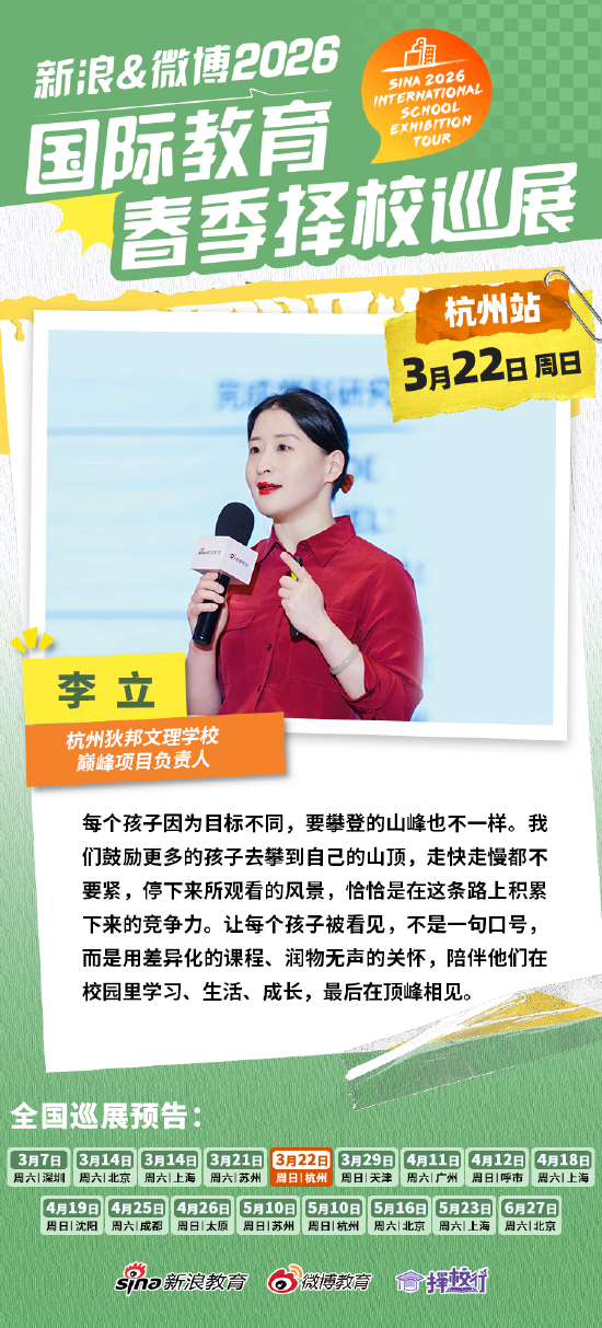 为回应家长在择校过程中的现实困惑,精准传递本年度招生新动向,3月22日,由新浪教育、微博教育、择校行联合主办的“新浪&微博2026国际教育春季择校巡展”在杭州顺利举行。杭州及上海国际教育领域的标杆院校悉数亮相,多位教育专家现场助阵,面向幼、小、初、高全学段,结合当下国际教育发展趋势,为不同课程需求、不同留学规划的家庭,提供专业、多元、精准的教育解决方案,搭建起院校与家庭的高效沟通桥梁。杭州狄邦文理学校巅峰项目负责人李立向到场家长介绍了学校在教育上的“融合”与“创新”。