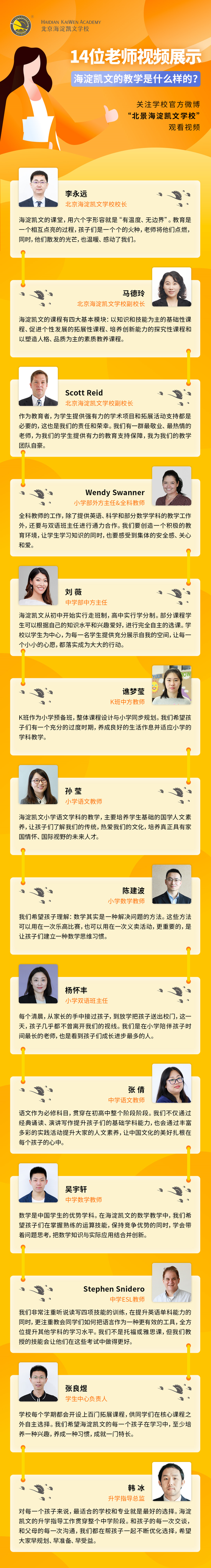 特殊时期,家长们不能实地探访学校,为了让家长更直观地了解北京海淀凯文学校,我们推出了14位老师的视频介绍,由校长、副校长、学部主任、各科老师带您深度访校,了解教学,探寻适合孩子的教育途径。