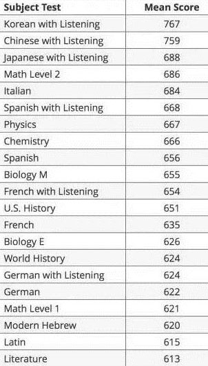 根据下图我们大概可以推测出一个好的成绩都是在700以上,通过下面的表格中的数据,我们可以了解每门SAT2相对应的高分。