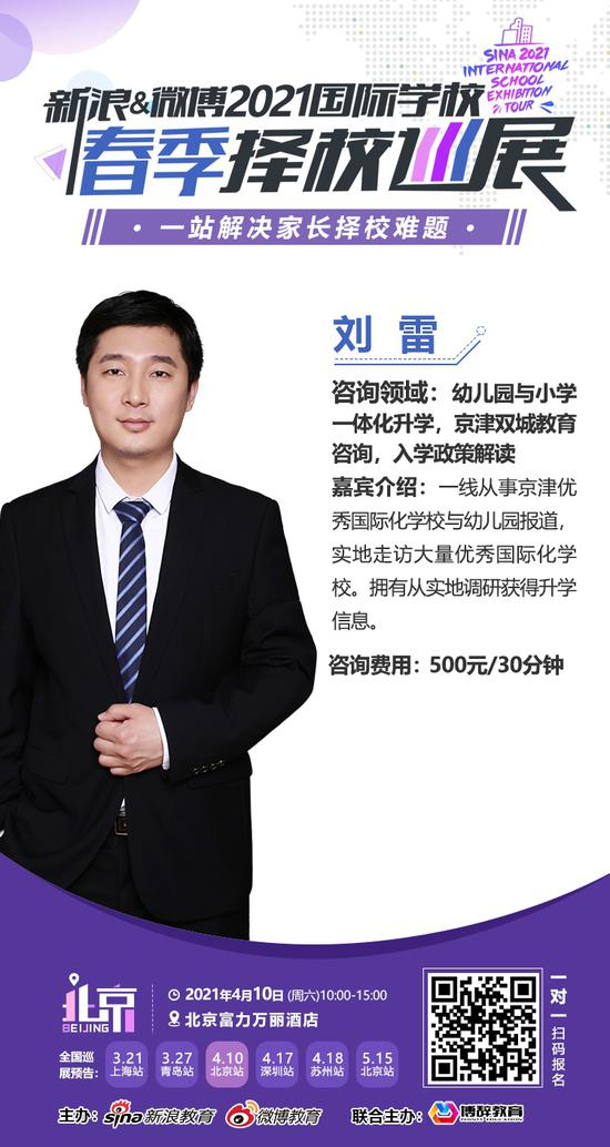 在2021年北京中小学升学季来临之前,新浪&微博为帮助更多的家庭做好升学季的准备,我们特邀吕付国、连红等知名升学政策专家于4月10日在北京富力万丽酒店,5月15日在北京长城酒店为大家第一时间线上线下解读政策,解答家长们的疑惑。展会上还设置了专家私享会,为各位家长解决教育难题和升学择校焦虑。