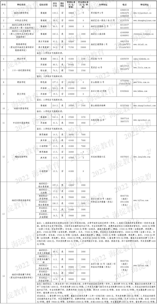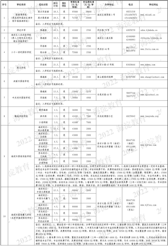 海淀区2022年民办初中学校招生计划表(海淀区)