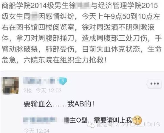 记者于下午2时许赶到学校,记者从知情学生处了解到,伤人者或为2014级商船学院徐姓学生,被伤女生为2015级经管学院周姓学生,行凶原因或为情感纠纷。