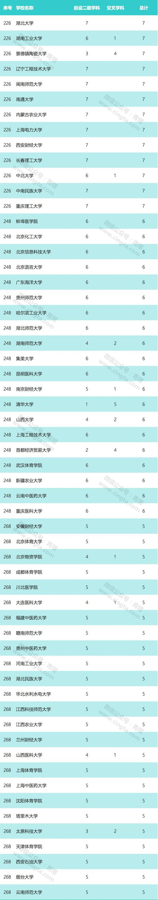 从统计结果来看,本次公布的高校学科名单中,共涉及422所高校,5167个二级学科和交叉学科,其中,自设二级学科4659个,交叉学科508个。另外,中共中央党校(国家行政学院)系统及科研院所共有99个自设二级学科,中国农业科学院的信息技术与数字农业和区域发展为2个交叉学科。