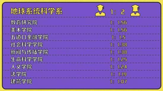 从各院系新生男女比例看,地球系统科学系以1:2的男女比,成为了女生比例最高的院系,共有10个院系的女生比例高于男生。