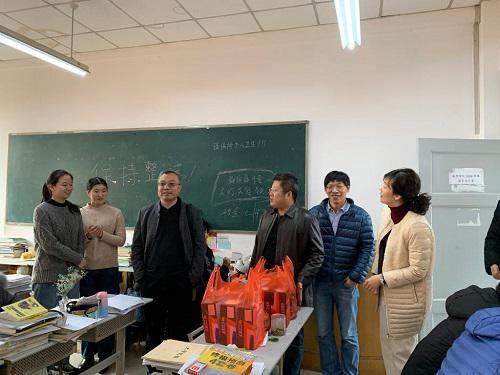 走访过程中,领导老师们为考研学生发放大礼包。陈猛鼓励大家要树立坚定的自信心,保持积极的精神状态,及时关注学生群里的天气预报提醒,注意防寒保暖。孔环提醒同学们一定要注意天气变化,要劳逸结合地做好最后的冲刺工作。刘西奎表示,大家的精神风貌都不错,希望同学们在考研之前的最后一周里继续努力,并祝愿大家考研成功。走访中,崔玉军还耐心的为学生答疑解惑。