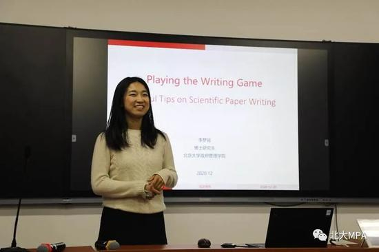李梦瑶同学以“Playing the Writing Game”为题,介绍了学术论文写作中的技巧。她首先详细分析了学术论文的结构,接着介绍了撰写文献综述的五个步骤,最后分享了论文写作过程中的一些实用技巧。