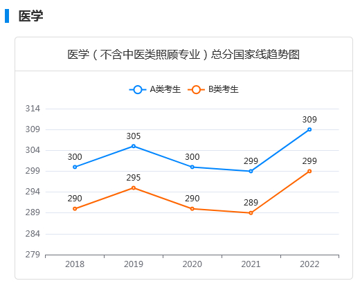 考研国家线是国家确定的进入复试的初试成绩基本要求,以下为医学近五年考研国家线及趋势图,供考研学子参考。