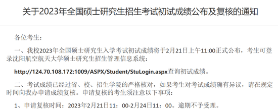 沈阳航空航天大学2023年全国硕士研究生入学考试初试成绩将于2月21日上午11:00正式公布,考生可登录沈阳航空航天大学硕士研究生招生管理信息系统查询初试成绩。成绩申请复核时间为2023年2月21日11:00-2月24日11:00。逾期不予受理。