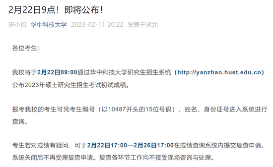 华中科技大学将于2月22日09:00通过华中科技大学研究生招生系统(http://yanzhao.hust.edu.cn)公布2023年硕士研究生招生考试初试成绩。考生若对成绩有疑问,可于2月22日17:00-2月26日17:00在成绩查询系统内提交复查申请。