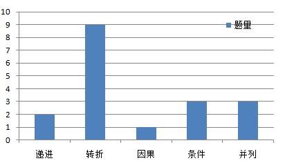 由图1可知,五类关联词都出现在我们的考试中,其中以转折关系、条件关系和并列关系居多;由图2可知,关联词考点在我们的考试中越来越重要,题量越来越多。这主要分析的是主旨概括题涉及到的,更不论意图判断题了。如果加上意图判断题,其题量还会继续增多。