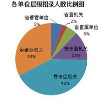 从单位层级来看,县市区招录人数为本次招录大户,有42%的人员为县市区招录,其次为乡镇办机关,招录人数占33%,省直机关招录人数最少,占2%。