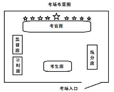 一般面试考场内共7-9名考官,坐在考官席中间的是主考官;考官席两侧分别为工作人员(记分员和计时员)的席位和监督员的席位。考生席一般在主考官席位的正对面,便于主考官与考生交流,桌子上会有铅笔、试题和稿纸,也有一些考场不发试题。