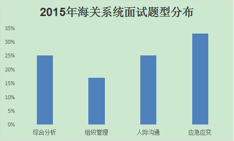 通过上述图表可以看出,2015年海关系统面试的题型相对稳定, 主要包括综合分析类、组织管理类、人际沟通类、应急应变类等结构化面试基础题型,分布较为均衡。但值得注意的是,海关系统的面试题往往题干情景设置较为复杂,一题往往可能会考查多个能力,使考生答题难度进一步加剧。题目设置也呈现稳重有变的趋势,比如人际沟通题更加新颖鲜活,贴近工作实际;组织管理突出难度,强调信息获取能力;应急应变一脉相承,身份设定变化多端;综合分析涉及面广,时效性强等,需要考生平时多加练习。