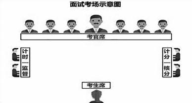 轮到你时,引导员会将你带入面试室,进入考场后,你会看到一群人,大概包括7名考官和4名工作人员,分别是主考官1名,考官6名,计分员、核分员、计时员、监督员各1名。他们的座次表如下图: