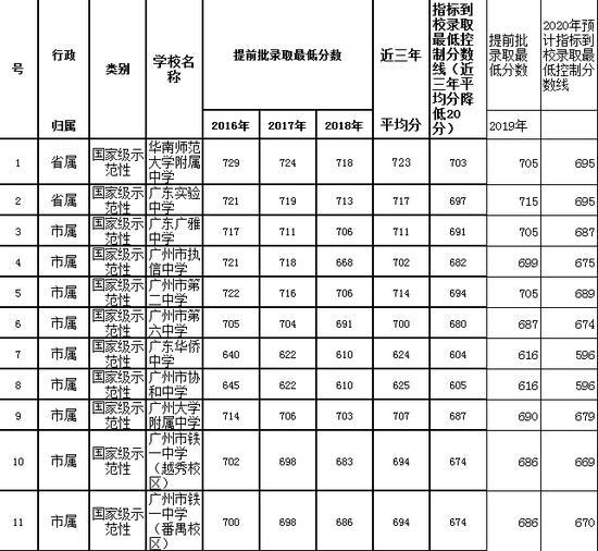 指标到校的录取最低控制分数线,是招生学校近3年在提前批最低录取分数的平均值下降20分。记者计算了所有高中的录取分数发现,2020年中考指标到校的录取最低控制分数线,没有一所学校会超过700分;即便是最高的华南师范大学附属中学(以下简称华附)、广东实验学校(以下简称省实),最低控分数线预计也只有695分。