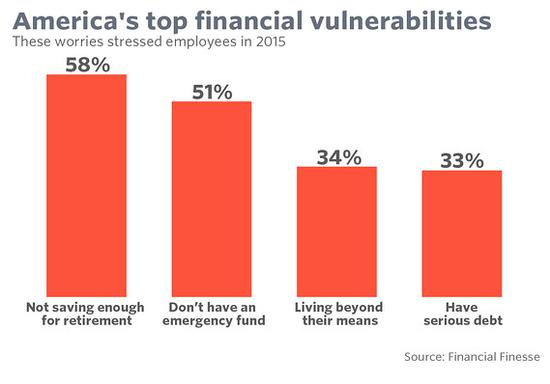 金融危机,经济衰退时,人们可能更担心失业,但此次调查发现,随着就业形势好转,失业只居美国人最担心的财政问题的第四位。而每天最想钱,最为金钱烦恼,或是想赚更多钱的年龄层,以25岁到44岁比率最高。年轻一代对薪水花光光、永远背负债务更恐惧。这是可以理解的,因为他们正是从大学毕业到结婚生子到准备给孩子上大学准备昂贵学费的阶段,经济上的压力最大。