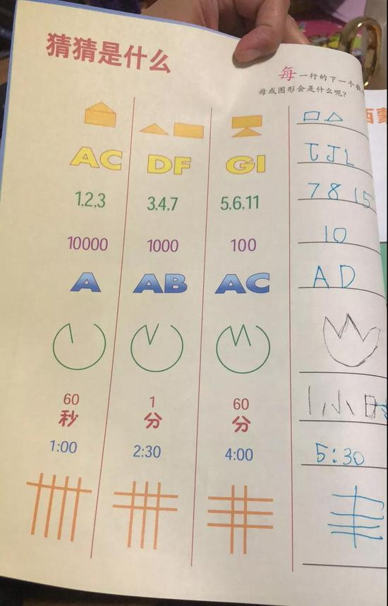 下图是最近她自己兴趣昂然的一本数学游戏册,我们念题目,适当引导以后,她自己完成,最后一题让我们意外地看一眼后马上做出了答案。