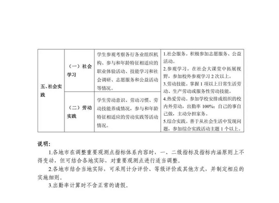 (五)社会实践。主要考察学生的社会认知、社会实践、社会适应状况,形成的劳动素养、实践能力等状况。重点记录学生在日常生活劳动、生产劳动、服务性劳动、参观学习、研学实践、志愿服务和公益活动中表现出的意识、能力和成果等。