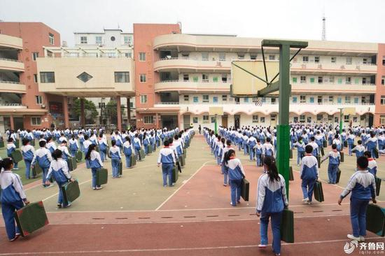“1、2……下横叉;1、2,仰卧推起成桥准备……”,上午课间,在老师的指挥下,伴随着《七舰战歌》铿锵有力的鼓点,济南市明珠小学三到五年级的学生们统一拿着军绿色地垫有序进入操场,准备开始做课间操。图为学生们进入操场。