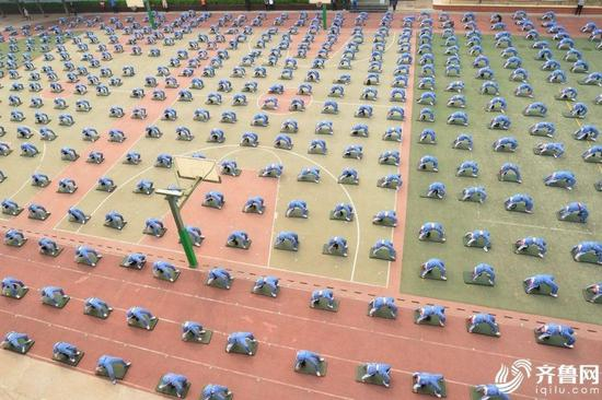 横叉、前滚翻、仰卧推起成桥、肩肘倒立……老师们将其用音乐串联,再附加上一些辅助动作,就是他们课间操的内容。即使在外人看来难度颇高,但孩子们整齐划一的动作和柔软矫健的身姿让记者感受到他们努力练习过的痕迹。图为学生们在做课间操。