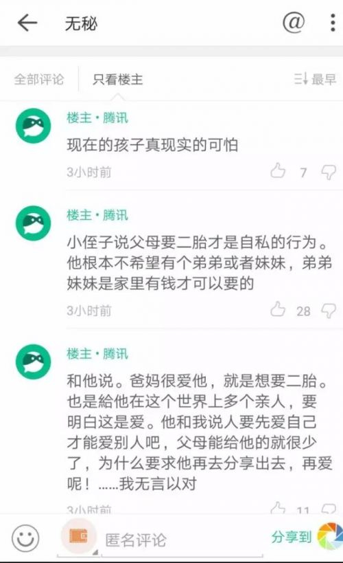 说白了,孩子是自己生的,想法和决定权从来都是家长的,“给孩子生个弟弟妹妹作伴”,妥妥的就是自我牺牲式的道德绑架啊。